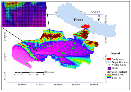 The study area was divided into a 250 m-by-250 m grid with reference to the MODIS product. 91 grid points ground data of the study area collected during Forest Resource Assessment (FRA) 2011–2016 was obtained from the Department of Forest, Nepal []. Another 62 grids were randomly selected to increase the density of plots and to incorporate agriculture and riverine classes which were not obtained from department of forest. Plots in the selected grids were then visited for field verification. Crown coverage of tree species in each grid was visually observed and noted. If a grid had more than 60% Sal trees, for example, then it was marked as Sal grid and so forth. Garmin GPSMap 64 and Garmin eTrex30 series handheld devices were used to record the geographical coordinates. For the inaccessible places, expert opinion of the local ranger was considered. Moreover, comparison of texture and structure of the places were made with that of already visited locations using high resolution images from google earth. Altogether, 153 grids were selected, of which 62 were Sal, 43 mix, 22 RVN and 26 agriculture. On average, a grid represents 28.7 square kilometer
