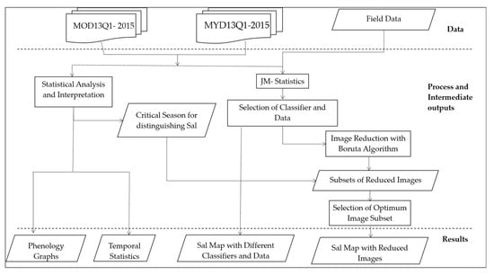 First, VI time-series values from all 46 images in the year are plotted in a graph for each forest type and agricultural area (cover types) to study multi temporal VI signature of different types. The curves are statistically interpreted to find the similarity and differences of phenophases among them. J-M distance was calculated to verify the goodness of samples. Then, NDVI and EVI time series data is each classified using two supervised machine learning algorithms SVM and RF to know which datasets provide better results and which algorithm is superior to next for Sal mapping. Furthermore, Boruta algorithm is applied to reduce the number of images. Additionally, reduced images are also obtained by statistical analysis and visual interpretation of the VI graphs. Performance of different subsets of reduced images is again compared to identify the optimal images. The methodology is represented in Figure 2 and further explained in the sections below.