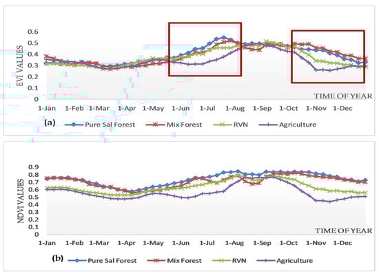 Contrary to EVI values, Sal NDVI values (Figure 3b) were always higher than mixforest throughout the year. The difference of NDVI values between Sal and mix forest was less in comparison to the difference observed in the case of EVI values during the same time and location. The NDVI values of agricultural area were the least followed by RVN. It was more difficult to delineate the signature between mix and Sal forest from NDVI signature in comparison to that of EVI.