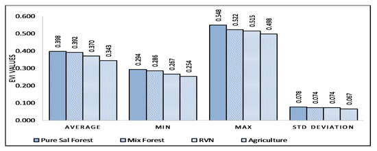 Furthermore, it was observed that Sal had the maximum annual values for average, min, max and standard deviation, followed by mix, RVN and agriculture, respectively (Figure 4). Average of Sal (0.397) and mix (0.392) were very close to each other. Standard deviation of mix (0.074) and RVN (0.074) was equal to each other. This provided a general understanding that Sal forest has higher annual values of EVI as compared to the rest of the forest types, but the difference was not wide enough to find a threshold value for the separation.