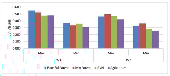 As shown in plotted graph, it was observed that the EVI of all the types were distinct in two periods shown by the red boxes (Figure 3a); (i) first window (w1) during the growing season between mid-May and mid-August; and (ii) second window (w2) during post monsoon season between early October and mid-December. So, seasonal statistical measures for these periods were computed (Table 1). Sal forest had the highest cumulative values (sum) and mean in the w1, but the mix forest took its place during w2. Slopes during w1 remained all positive while they were all negative during w2. Sal and mix forest had higher variance during w1, while RVN and agriculture had higher values in w2. Similarly, maximum and minimum EVI value of Sal was higher than the mix forest during w1, while same measures were lower than that of the mix forest during w2 (Figure 5).