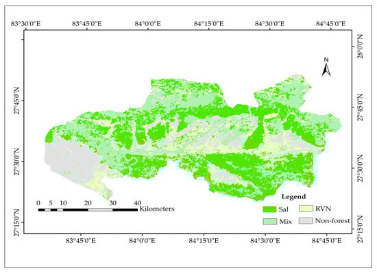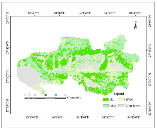 Map showing distribution of Sal and other forest types in the study area using SVM-EVI.