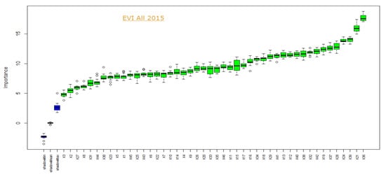 The result obtained from image reduction using random forest based Boruta algorithm evinced that all of the images were important for the classification, with image band X36 being the most important and X3 the least important of all 46 EVI images (Figure 7). X1, X2, … X46 represent the images of DOY 1, 8, 16, … 357 of 2015. The most important 24 images for EVI using Boruta, 21 images determined by visual interpretation of the graph plot (Figure 3a) and the most important 24 images for NDVI using Boruta have been presented in Table 4. The image sequence is in order of importance. Interestingly, out of the 12 most important images selected by Boruta (first row of Table 4), 10 images were also present in the subset of 21 images derived from the graphical analysis presented in the third and fourth row of Table 4 and highlighted with bold character. The NDVI had a different hierarchy of importance with image X24 being the most important one.