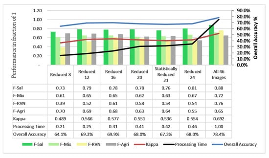 While the number of input images was reduced, the processing time also decreased. Most importantly, images 8, 12, 16, 20 and 24, suggested by Boruta algorithm, yielded results in 20, 24, 30, 40 and 45 h, respectively. The 12 most important images selected by Boruta algorithm outperformed all the remaining reduced subsets. The statistically reduced 21 images also provided almost equal performance. The F-score for Sal with 12 images was 0.79, and that with 21 images was 0.77, which was 90% and 87% of the best result obtained when full images was used. It was observed that even by increasing the number of images to 16, 20 and 24, there was no better result; although processing time increased in proportion to the increased images. There might be duplicate information carried by different images, which would have resulted in giving either a similar performance even by increasing the total number of input images. Utilizing the importance score of the Boruta algorithm, the researcher can enjoy the liberty of choosing different subsets of a varying number of images and determine optimum images, considering the tradeoff between accuracy and time.