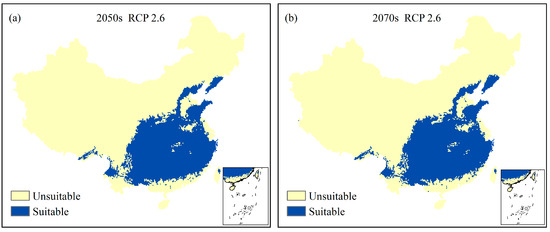 The future potentially suitable climatic geographical range of L. chinense under different climate change scenarios was relatively stable compared to its current status (Figure 3). In both the 2050s and 2070s, the suitable climatic habitats were still centrally distributed in Southeastern China and sporadically distributed across the northern coastal areas (including the southern part of Liaoning, Beijing, Tianjin, and Hebei) and the southwest border (including the southern part of Guangxi and Tibet, as well as the northern part of Yunnan). However, the suitable climatic habitats showed a slight contraction in Anhui and Jiangxi under RCP 4.5–2070 (Figure 3d).