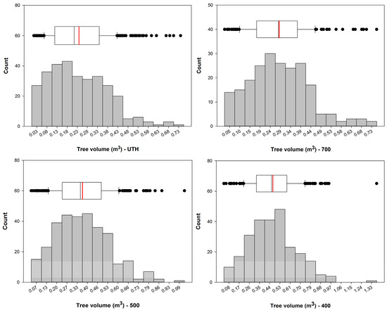 Combined histogram/box-plot charts for variate “Tree volume” by stocking treatment. The vertical red line in the box plot corresponds to the mean value.