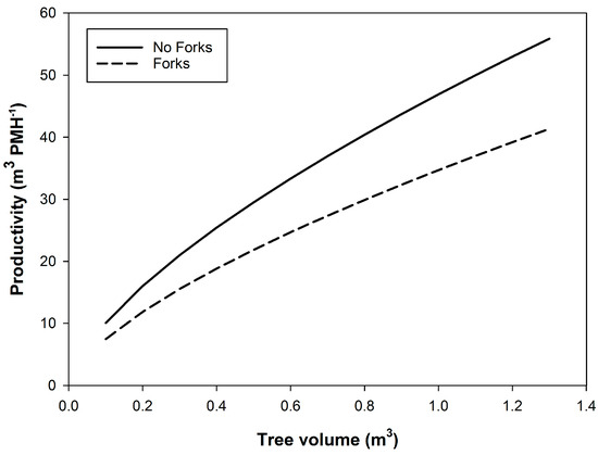 Harvester–processor productivity increased with increasing tree volume, though the rate of increase was less for trees with forks (Figure 4). Using the productivity model (Equation (3)), the yield per ha equations (Figure 2), and the actual merchantable stocking values (Table 2), the mean predicted harvester–processor productivity values for the UTH, 700, 500, and 400 sph treatments at the rotation age (9.5 years) were 14.5, 18.3, 22.8, and 25.9 m3 PMH−1, respectively. The impact of forks on harvester–processor productivity became more prominent as tree volume increased.