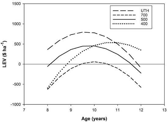 The LEV peaked at ages 9.6, 10.0, 9.8, and 10.8 (theoretical optimal rotation ages), for the UTH, 700, 500, and 400 sph treatments, respectively (Figure 5). For all treatments, the theoretical optimal rotation age exceeded the trial rotation length (age 9.5). The 700 sph treatment was found to have a substantially lower LEV due mainly to it having a lower harvesting productivity (higher harvesting cost per cubic metre) compared with the 500 and 400 sph treatments, and a lower revenue compared with that of the UTH treatment due to the 700 sph treatment having the second-lowest yield per hectare and the second-highest rotation length.