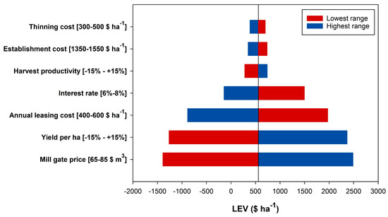 Figure 6 presents a tornado chart showing the sensitivity analysis results for the 400 sph treatment for a number of factors impacting LEV (and the corresponding lowest and highest ranges). The trend was very similar for the other treatments. Variation in mill gate price and yield per ha had the highest impact on LEV. Unfavourable conditions, such as higher thinning costs, establishment costs, and leasing costs, as well as lower yields per hectare, harvesting productivities, and lower mill gate prices, negatively impacted LEV and postponed the optimal rotation age. As expected, increasing interest rates resulted in an earlier rotation age (11.0 and 10.6 years for interest rates of 6% and 8%, respectively).