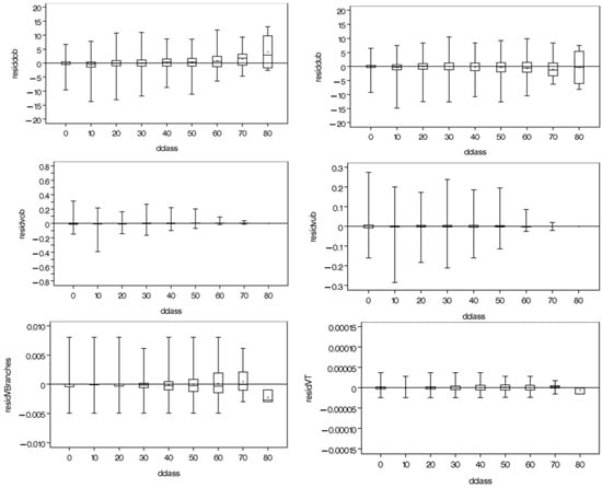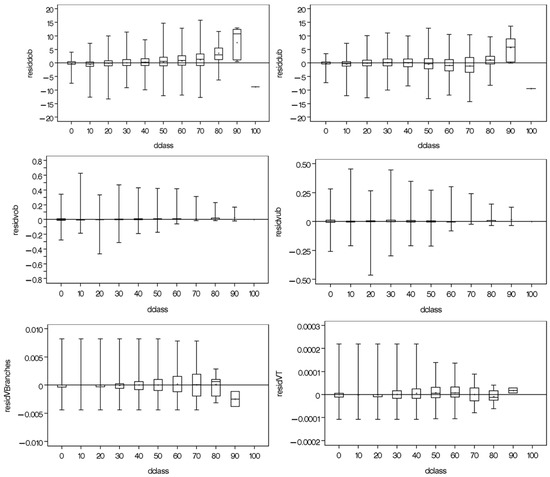 Scatter plots of the unweighted residuals against diameter classes are shown in Figure 2 and Figure 3. For most of the volume variables in both species, a narrower range in the unweighted residuals could be observed for the higher diameter classes (above 60–70 cm). We speculate this could be due to a limited number of trees sampled in this large diameter range, which are indeed very scarce in harvested forest stands in the area of study. Although crown ratio was considered in predicting branch volume, branch volume was slightly underestimated in the largest diameter classes for both species. Very mature trees tend to have lower branch and leaf allocation (e.g., [13,69], together with some possible crown senescence. Caution must therefore be taken in using the derived equations in very large trees of diameters above 60–70 cm.