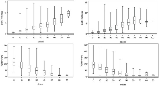The models obtained enable prediction of bark volume and bark thickness. Bark thickness increased with increasing tree size (Figure 4, upper figures) in both species, in accordance with studies reporting a positive correlation between bark thickness and diameter at breast height in other conifer species (e.g., [74,75]). For the larger diameter classes, P. cooperi bark was thicker than P. durangensis bark. Average percentages of bark volume relative to stem were respectively 17.2% and 19.8% for P. cooperi and P. durangensis, ranging from approximately 10 to 30% for both species. Figure 4 (lower figures) shows the percentage of volume for tree diameter classes. As expected (e.g., [76]), lower values of relative bark volume were found as diameter at breast height increased. Lower percentage values were found for P. durangensis. Such variation is an important criterion in considering the target diameter in uneven-aged management of pinewoods, with important implications for log merchandising (e.g., [77]).
