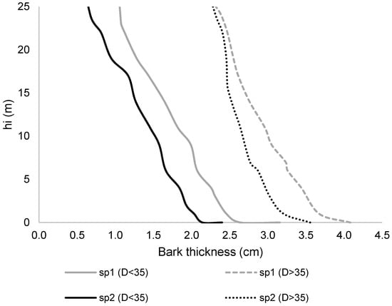 The proposed equations enable bark thickness to be modelled across tree height. Figure 5 represents the variation in predicted bark thickness along the stem heights hi for two diameter classes (i.e., above and below 35 cm) for both species. As expected, a decreasing pattern of bark thickness with height is predicted for both species, with the thinnest values at the tree top for both diameter classes of the two species of study. The P. cooperi bark was thicker than the P. durangensis bark for both diameter classes, and this difference was more marked for the smaller diameter (<35 cm) trees. The thickness of bark relative to diameter variations along the stem is known to be related to the ability of pines to resist fires of different intensity (e.g., [78]). Therefore, P. cooperi may potentially be more resistant to intense fires.