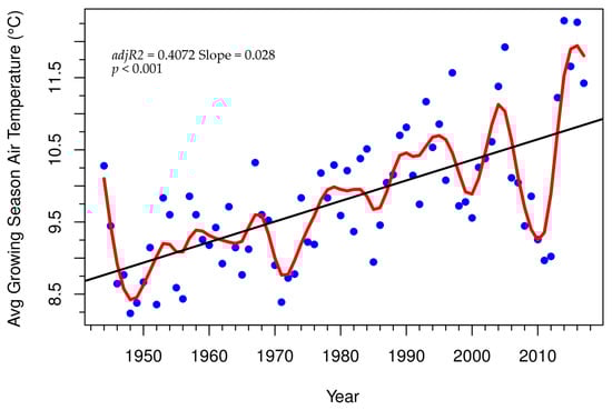 Change in average growing season air temperature (°C) (May–September) between 1944 and 2017 at Homer, Alaska airport on the Kenai Peninsula. Dots are the average growing season air temperature, and the curved line is the mean of growing season air temperatures. Temperature has risen an average of 0.03 °C per year since 1944 (p < 0.001).