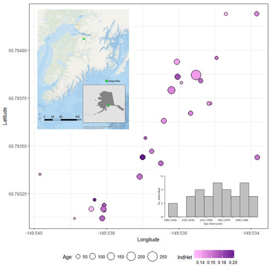 Inset map; Palmer Creek Drainage within the Chugach NF on the Kenai Peninsula, Alaska. The green points represents the study site both at the state scale and on the Peninsula. The transect map shows the geographic position of each tree on the sampled transect with circle size related to the age of the tree and the purple gradient representative of the level of individual observed heterozygosity (IndHet) measured at 4665 genome wide single nucleotide polymorphisms (SNPs); the darker the color purple, the more genomically diverse the individual (see Table 1 for IndHet values). Histogram inset: Age structure of Mountain Hemlock along the study transect representing the chronology length from 1900 to 2012.