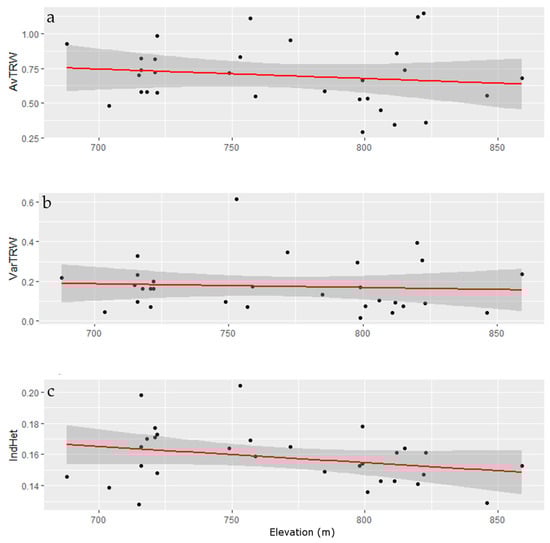We tested our prediction of a negative association between VarTRW and IndHet and a positive relationship between AvTRW and IndHet using Pearson’s correlation coefficient and linear regression. Moreover, we tested the degree to which AvTRW, VarTRW, and IndHet were correlated with elevation. We tested the significance of the correlations using a Student’s t-distribution and stats in the R base package [51]. Significance was assessed at 95% confidence.