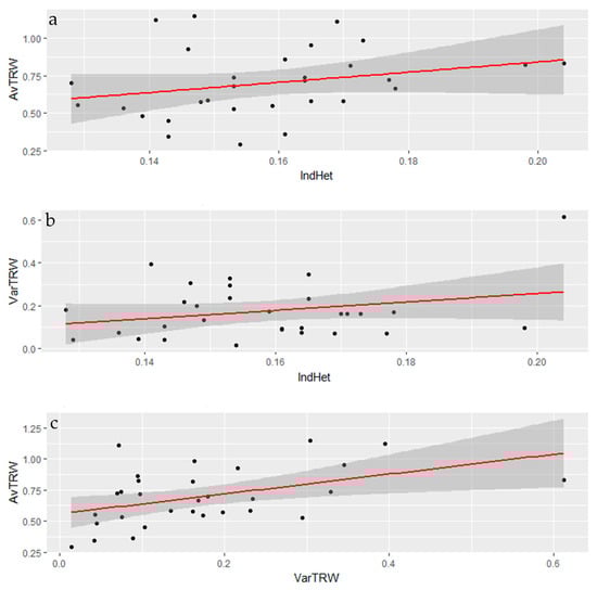 Regression analysis of (a) average tree-ring width (AvTRW) (adjR2 = 0.03743, intercept = 0.160, slope = 3.3995, p = 0.156); and (b) tree-ring variance (VarTRW) (adjR2 = 0.040, intercept = −0.1369, slope = 1.9667, p = 0.148) with individual heterozygosity (IndHet), and (c) regression of AvrTRW with VarTRW. AvTRW and VarTRW were significantly associated with each other (adjR2 = 0.17818, intercept = 0.5583, slope = 0.7992, p = 0.012).