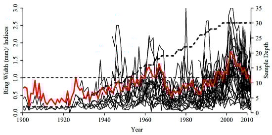 Individual tree-ring width (black line) and site ring width index chronology (red line) of Mountain Hemlock along the study site transect. Sample depth is represented in black dotted line.
