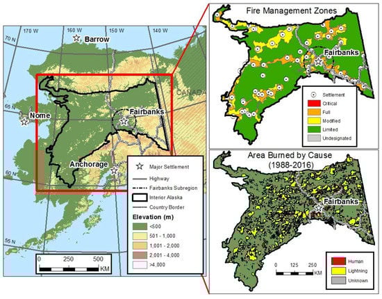 - Calef, M.P.; Varvak, A.; McGuire, A.D.; Chapin III, F.S.; Reinhold, K.B. Recent changes in annual area burned in interior alaska: The impact of fire management. Earth Interact. 2015, 19, 1–17. [Google Scholar] [CrossRef]