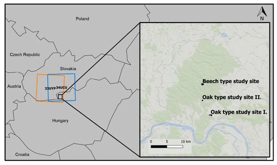 Location of forest study sites in Hungary with Sentinel-2 footprints.