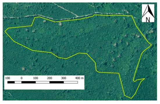 The 38.2 ha beech-dominated study site is situated in the higher region of the mountains (47°55′55.78″ N 18°56′37.61″ E) (Figure 4). Its mean height above sea level is 750 m. The dominant tree species is beech. Additional tree species with a lower mixture ratio are present: sessile oak, ash (Fraxinus excelsior L.) and sycamore maple (Acer pseudoplatanus L.). The exposure of this site is southwestern. The mean slope angle is 20°. The more homogeneous topography is compensated by a heterogenic vertical forest structure. Several natural disturbances since the late 1990’s have affected the structure of this beech forest at the study site. These events and the usage of artificial treefall gaps transformed the even-aged forest into an uneven-aged forest. Studies were carried out for modelling the natural disturbances [31,35] including this study site. The site was affected by ice damage in 1996, 2001, 2004 and 2014 and by wind fall in 1999 and 2010 [40]. The recent ice damage caused mainly broken crowns and less treefall because unstable trees had already fallen due to the previous disturbances. Due the fast and strong natural regeneration of beech [41] in the treefall gaps, the terrain is covered by seedlings and young trees and some weeds [42]. The mean height of the old trees is 26 m. The heights of the young forest inside the tree fall gaps vary according to their age but they are clearly separating from the older forest parts. The shapes of gaps differ from the oak type. Their diameters are much larger (30–40 m) and the shape is less compact. Often, adjacent gaps are connected into bigger patches.