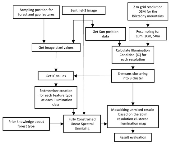 A workflow was implemented during the research to detect artificial treefall gaps on Sentinel-2A satellite images. These maps are essential for a more sustainable forest management. The preprocessing of images highly affected the results. In the oak forest, the BOA reflectance gave the most promising result with topographic normalization. For the beech forest, the BOA reflectance without topographic normalization showed better results. At least 100 spectral sample positions from each category with high accuracy would be enough for a region to create spectral endmembers. The accuracy of the DSM for illumination modelling has an important influence on the shadow map we derived. The DSM should match the conditions captured at the satellite images. In Hungary country- wide, commercial DSMs [45] are available every 5–10 years which can be used for this purpose. By using a longer time series which covers the whole vegetation period, a more precise filtering could be made for false gap signals. However, it has not been available with Sentinel-2 until now. With the recently launched Sentinel-2B [74], a denser time series will be available in the future. The vegetation period of 2018 could be the first time when the pair of calibrated Sentinel-2 satellites can deliver a dense time series. One cloudless observation per month from a forest compartment is enough to get acceptable results.