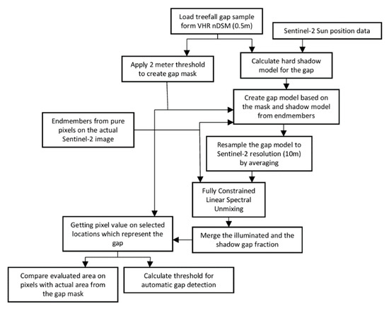 A complex workflow was developed for detecting treefall gaps (Figure 5). It consists of a shadow modelling, spectral unmixing and image mosaicking steps. A synthetic treefall gap method was used for the area evaluation.