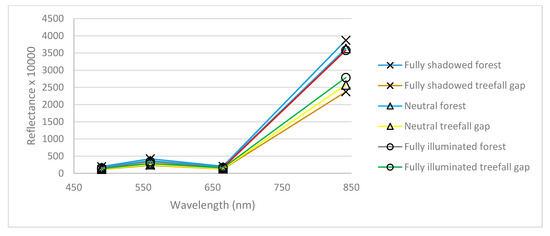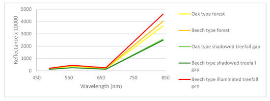 The mean height of the forests is around 25 m at all study sites. The diameter of a gap is approximately 20 m. When the satellite passes the study area in the morning (9:50 GMT), a projected shadow is visible on the bottom of the gap if it has neutral or northern aspect. This causes significantly lower NIR values in the gap among with the other bands. The ratio-based indexes like vegetation indexes [55] would normalize this difference. The gaps in the southern aspect have just the opposite spectral profile. Direct sunlight reaches the bottom and young trees or dense vegetation show higher NIR values than the neighboring trees. This phenomenon occurs especially in beech forests where the gap is usually bigger than for oak forests.