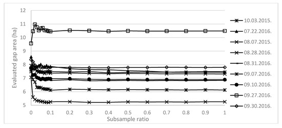 We wanted to determine the optimal number of spectral samples to create endmembers. Therefore, a subsampling was carried out using the existing endmember samples. We subsampled the spectral sample dataset from 100% to 10% by 10% steps, and from 10% to 0% by 1% steps. The subsampling was done by random selection. An array containing the indexes of the spectral samples was randomly shuffled by C++ STL function [72] and the first n element was selected to create an endmember, where n is the number of samples at a certain subsampling ratio. When the subsampling ratio was set to 0%, it used only 1 randomly selected sample. The endmembers were created from the subsampled spectral data for the forest and gap features. The unmixing workflow was done using the created endmembers for each Sentinel-2 image. Two hundred iterations were done for each Sentinel-2 product (L1C, L2A, L2ADEM). Each treefall gap fraction area was evaluated from the unmixed results. A constant 0.7 threshold was applied for each image. The mean value of the area from iterations was considered during the evaluation.