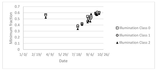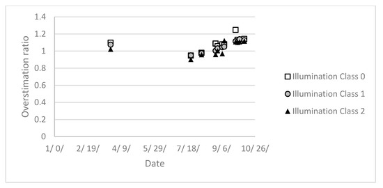 This method is also useful for estimating the ratio of the detected area and the reference area. It is assumed that the detected area on the satellite image highly depends on the elevation of the sun. The L2ADEM type data endmembers were used for the modelling.