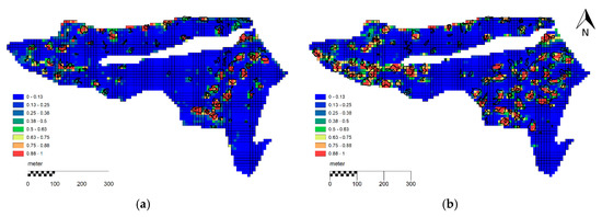 Treefall gap fuzziness map evaluated from 2016 at the BS on a 10 m resolution grid (a). Regeneration strength map of partial crown damage between 2015 and 2016 on the same 10 m resolution grid (b).