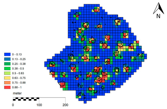 Treefall gap fuzziness map evaluated from the merged time series of 2015 and 2016 at the OS2 on a 10 m resolution grid. Reference treefall gap polygons are shown with black outline.