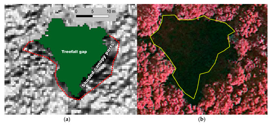 Overestimation of gap size modelled on DSM (a) and the same treefall gap contour on a 0.1 m resolution color infrared orthophoto captured with lower sun elevation (b).
