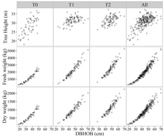 For the accurate estimation of stump volume over the butt swell, the trigonometric variable-form taper model of Bi [55] was fitted to the taper data from the 48 sample trees, but separately for T0, T1 and T2 stands. This model is stable in specification yet flexible in its ability of fitting data for species and tree sizes with different stem forms. Its predictive performance was well demonstrated for many native forest and plantation species in Australia [55,56]. For each of the 239 trees that were destructively sampled, an overbark taper curve was derived from its DBHOB and total tree height using the corresponding taper equation for its stand type. Then the predicted taper curve was calibrated using its stump height and diameter to generate a tree-specific overbark stem profile. Finally the stump volume was calculated through numerical integration of the tree-specific stem profile from ground level to stump height with an interval of 1 cm. At the same time, the volume of the butt log above the stump was also calculated by extending the numerical integration from the stump height over the log length. The ratio between the measured fresh weight and the calculated volume of the butt log was then used to convert the calculated stump volume to fresh weight for the sample tree. Following the calculation of stump fresh weight, the total aboveground fresh weight was calculated for each of the 239 sample trees (Figure 2).