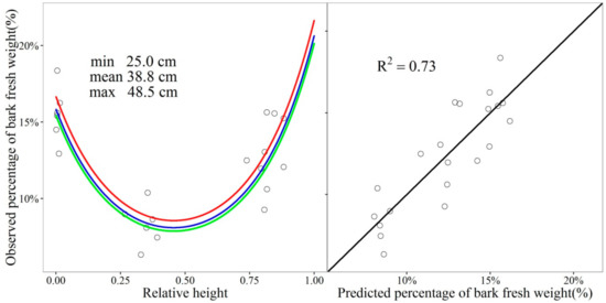 Observed percentage of bark fresh weight in relation to relative height (left) and to the predicted values (right). The three curves on the left-hand side from top down represent values estimated using Equation (3) for the minimum, mean and maximum DBHOB among the nine trees. The diagonal line on the right-hand side is the line of unity.
