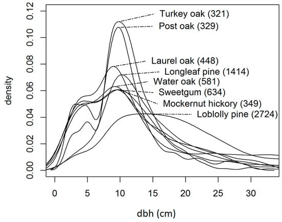 Plot locations were selected purposively to cover the range of tree sizes and stand compositions that occur on the Savannah River Site. Field measurements were taken on 194 field plot locations selected purposively to sample across multiple vegetation classes and sizes. Of the 194 plots, 4 were dropped because it was determined that they were measured in locations outside of our target population. A summary of the tree and plot variables used for this study is provided in Table 1. Additionally, a visual representation of the empirical dbh density functions for the 8 most common species occurring on plots is shown in Figure 2. Additional forest attributes (besides dbh) used in our analyses included trees per hectare (TPH), basal area per hectare (m2/ha, BA), Lorey’s height (m, Lor.), and total cubic stem volume (m3/ha, Vol.).