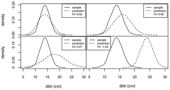 To provide a sense of the behavior of our indices as a function of prediction performance, we provide a visual calibration image which shows H values for various levels of departure from agreement between a sample and a prediction (Figure 3). Our quantitative examination of the properties of H relative to prediction properties used simulated dbhs. Our simulated population is a mixture distribution composed of two normal distributions (the solid line in Figure 4). For our examination, we took 100 clustered sample plots of 50 trees from the simulated population, and compared these with “predictions” for the samples. In Figure 4 we can see all three cases: (1) the underlying population, (2) the distribution observed on a plot, and (3) the prediction for the plot. For the purposes of demonstration, predictions were obtained by taking the original sample data and introducing Gaussian noise with parameters (). In our simulations, we look at various dbh bin widths and four types of errors in our predictions, where the four types of prediction errors are represented as four separate lines and labeled with the parameters of their error distributions. Larger values of index H suggest better prediction performance, where H is bounded by one on its upper end. A value less than zero indicates that the mean by bins (as obtained from all sample plots) is a better predictor of the sample distribution than the prediction strategy under examination.