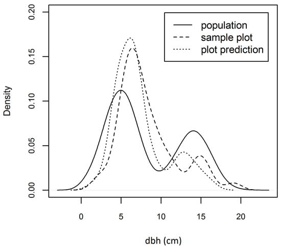 The distribution of diameters at breast height (dbh) is an important component of most forest inventory, management, and monitoring strategies. Dbhs are needed to describe stand properties because variables such as growth, volume, market value, conversion-cost, product specifications, and future forest prescriptions are dependent on trees’ dbhs. The use of single-tree level growth and yield models almost always requires dbh distributions. Dbhs are also used to assess forest sustainability based on whether the quantity and sizes of growing stock are suited to replace the current population of harvestable trees []. Information about dbhs also informs the type and timing of management strategies and economic value of the stand []. Ecological analyses also use dbh density information including, for example, assessments of vegetative diversity [], insect disturbance mechanics [], habitat suitability [], and suitability and distribution of parent stock for coarse woody debris [].