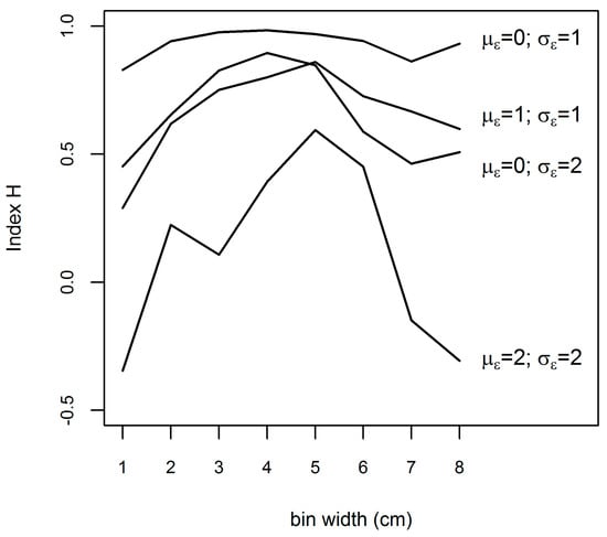 Effect of bin width on index H values for different combinations of mean and standard deviation values.