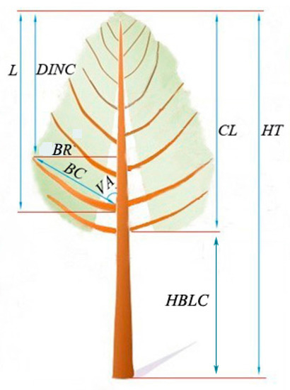 DBH and CW were measured for all the sample trees before they were felled. A straight line was used to determine the azimuth of all the branches, and was marked from the ground to the height of the DBH on the northern side of the trunk and extended to the tree tip after the tree was felled. When the sample tree was felled, the total tree height was re-measured and the height to the first live branch of the whorl containing at least three branches (HBLC, m) was measured. In our study, the lowest whorl containing at least three branches was defined as the crown base. Thus, crown length (CL, m) was defined as CL = HT – HBLC. The trunk was divided by one-meter sections from the base of the trunk to the tree tip, and the smaller than one meter section remaining was recognized as the tree tip. Branch diameter (BD, mm), branch angle (VA, °), branch chord length (BC, cm), and absolute depth into the crown from the tree tip down to the branch basis (L, cm) were measured sequentially for all the branches from a specific section from the tree tip down to the crown base after the section was placed upright on the ground. For all branches, the branch radius (BR) was calculated as the product of its branch chord length and the sine of the branch angle, and the corresponding absolute distance into the crown (DINC, m) was the difference between the length from the tree tip to the branch base and the projection onto the trunk of the branches based on the trigonometric relationship. Relative distance into the crown radius of interest (RDINC) was defined as RDINC = DINC/CL. In our study, a total of 3658 branches were measured. The statistics of the sample trees and branches are listed in Table 2, and the branch variables are described in Figure 1. The branch with the largest crown radius from each whorl of all the sample trees was selected and was recognized as the whorl radius (WR). Thus, a total of 889 of the largest branches were selected.
