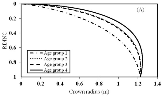 The dummy variable approach based on the best equation selected was used to analyze the effects of stand age and stand density on the crown profile, respectively. All trees were divided into four groups (<20, 21–30, 31–40, 41–50) based on the stand age and four groups (<1000, 1001–2000, 2001–3000, >3000) based on the stand density.