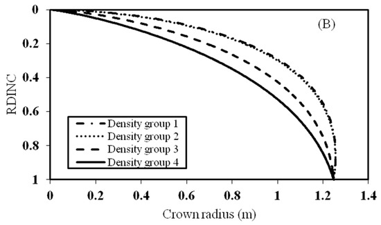 Effects of stand age and stand density on the crown profile based on the dummy variable approach. (A) reflects the effect of stand age on the crown profile and (B) reflects the effect of stand density on the crown profile. Age group 1 represents the stand age lower than 20 years, Age group 2 between 21 and 30 years, Age group 3 of 31–40 years, and Age group 4 between 41 and 60 years. Density group 1 represents the stand density lower than 1000 trees ha−1; Density group 2 between 1000 and 2000 trees ha−1; Density group 3 between 2000 and 3000 trees ha−1, and Density group 4 of larger than 3000 trees ha−1.