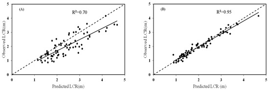 Observed largest crown radius (LCR) plotted against the predicted crown radius by the quantile regression (A) and quantile regression for linear mixed-effects model (B).