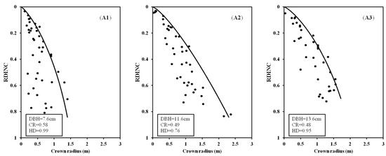 where WR is the whorl radius of the crown based on the largest branches selected from each whorl; RDINC is the relative distance into the crown; and a1, a2, and a3 are the parameters to be estimated. To make the curve reasonable in describing the outer crown profile, the parameters should be restricted as a1 > 0, a2 > 0, and a3 < 0. By analyzing the relationship between the parameters and tree variables, DBH, CR, and HD were at last introduced into the equation and the model is finally defined as Equation (2):