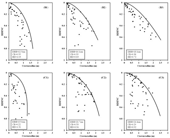 The fitted outer crown profiles against the observed crown radius for three sample trees from three same plots (stand age is 20 years and stand density is 3950 trees ha−1 for tree (A1–A3); stand age is 33 years and stand density is 1883 trees ha−1 for trees (B1–B3); stand age is 44 years and stand density is 1640 trees ha−1 for trees (C1–C3)) for the planted Pinus sylvestris var. mongolica trees.