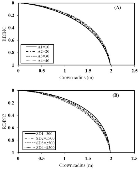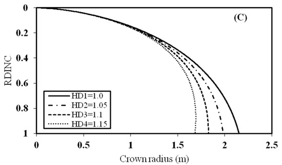 One medium sized tree was selected to analyze the effect of stand age, and stand density on the crown profile. HD is another variable that reflects the effect of stand density on the crown profile, so it was also analyzed (Figure 5). In Figure 5A, the effect of stand age on the crown profile was analyzed while the other variables were kept constant. This indicated that the crown radius of the tree increased with increasing stand age. The RDINC of the tree was divided by 100 intervals and the difference of each interval between A1 and A2, A2 and A3, A3 and A4 was calculated. The sum of the difference for the 100 intervals of A1 and A2, A2 and A3, A3 and A4 was calculated. The sum of the difference of A1 to A2 was 20.38 m, 20.93 m for A2 to A3, and 21.51 m for A3 to A4. Thus, the growth rate of the crown radius of planted Pinus sylvestris var. mongolica trees from A1 to A4 within the stand age of between 12 and 46 years increased with increasing stand age. For Figure 5B, the crown radius decreased with increasing stand density. Similar to the analysis method used for stand age, the sum of difference of SD2 to SD1 was 26.63 m, 27.55 m for SD3 to SD2, and 28.53 m for SD4 to SD3. This showed that the growth rate of the crown radius decreased with a decrease in stand density. In contrast to stand age and stand density, the tree variable HD showed a relatively larger effect on the crown profile (Figure 5C). HD mainly affected the crown profile of the lower part of the crown. The crown radius decreased with increasing HD. The sum of difference of HD2 to HD1 was 74.79 m, 70.63 m for HD3 to HD2, and 66.73 m to HD4 to HD3. The growth rate of the crown radius decreased with increasing HD.