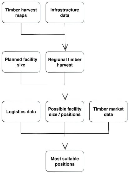However, since the production of wood is limited, there is a growing demand for regional and large-scale assessments [8,9]. Several studies modelled forest supply chains [10,11,12,13], which at times included the allocation of production facilities for existing technology options (e.g., chipping or power plants) [14,15,16,17]. The latter studies specifically optimized the allocation of heating or wood chipping facilities addressing an optimisation problem. As new, bioeconomy technology options are still under development though, full-scale modelling and optimized allocation are not yet possible. Instead most technology options and processing pathways for bio-based products are under development or in a pilot phase, apart from biofuel production [18,19].