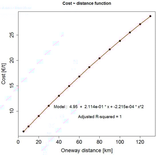 To convert timber volume (solid cubic meter) to Mg of dry biomass, we used a conversion factor of 1.866 m3 t−1 at 0% moisture derived from wood densities [29] for mixed softwood and hardwood weighted by the main tree species (abundance > 0.5%) from the third NFI data. Using distance and cost values, we built a simple linear model with a quadratic function (Figure 3). The model featured an r2 of ca. 1 and a RMSE of €0.01, thus allowing for precise fitting of all distance values in the given interval (5–130 km). We used this model to calculate costs according to actual mean transport distances within our service area (Table 4).