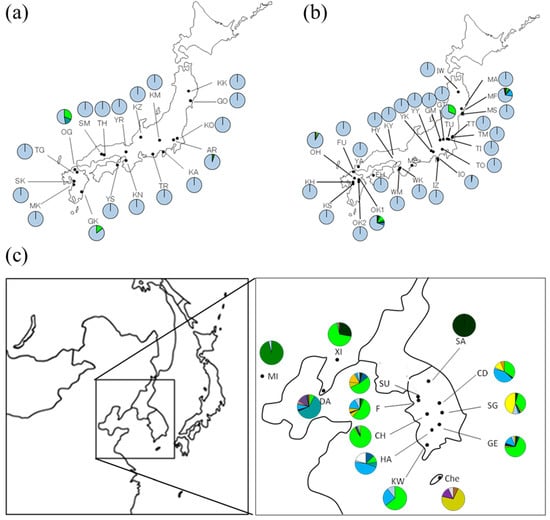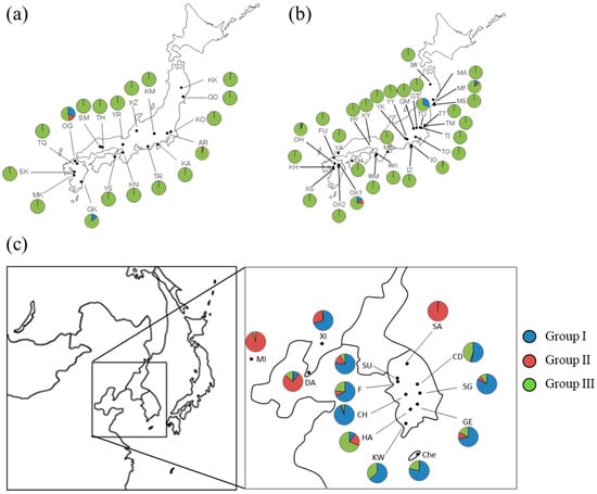 Three chloroplast haplotype group distribution of Q. acutissima for (a) 18 natural populations in Japan; (b) 28 artificial populations in Japan and (c) 13 continental populations.