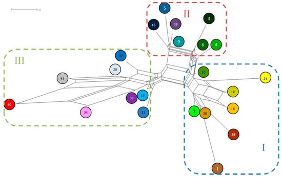 A Neighbor-net of 23 Chloroplast haplotypes for Quercus acutissima. Haplotypes of Group I were distributed mainly in Korea, haplotypes of Group II were in China and northern Korea and haplotypes of Group III were dominant in Japan.