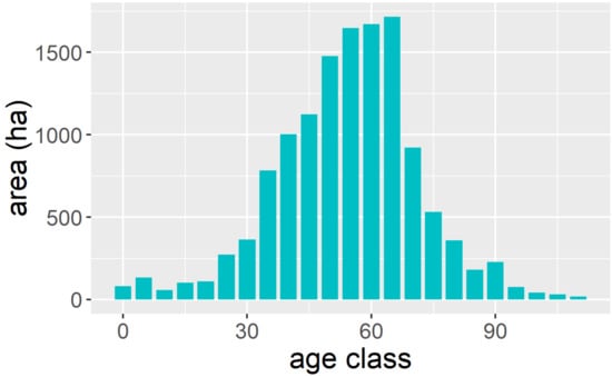 Current distribution of forest age classes in the study area: forest age was separated by every five years in each class.